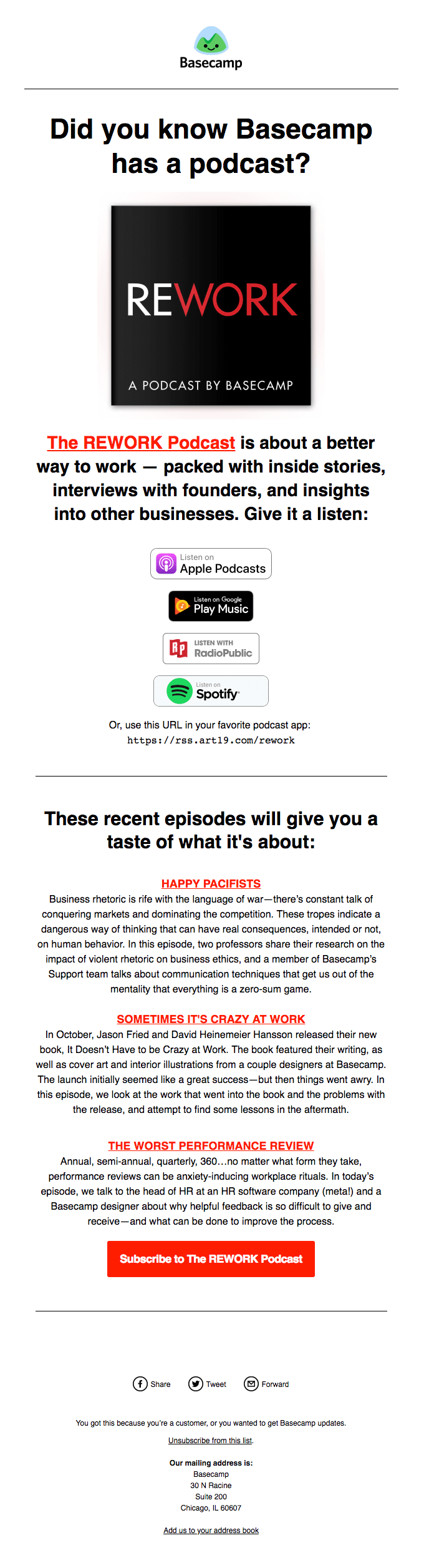 In this email from Basecamp, their primary call to action (CTA) is to subscribe to the REWORK Podcast.