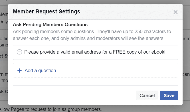 If you’re running a Facebook group, you can ask for an email address as a part of the membership requirements. Be sure to mention if you’re adding them to a subscription list or if you’re simply sending them thank-you goodies for signing up.