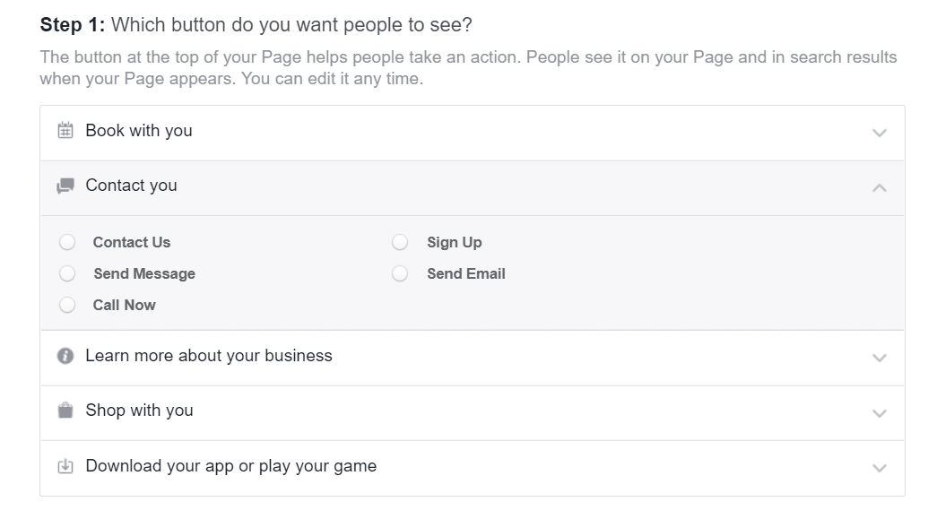 Facebook has a built-in call-to-action button. These buttons have specific functions, and they may be exactly what you need. Under your cover photo, click the blue button that reads, “Add a Button.” You’ll find a variety of options to guide your readers to take action.