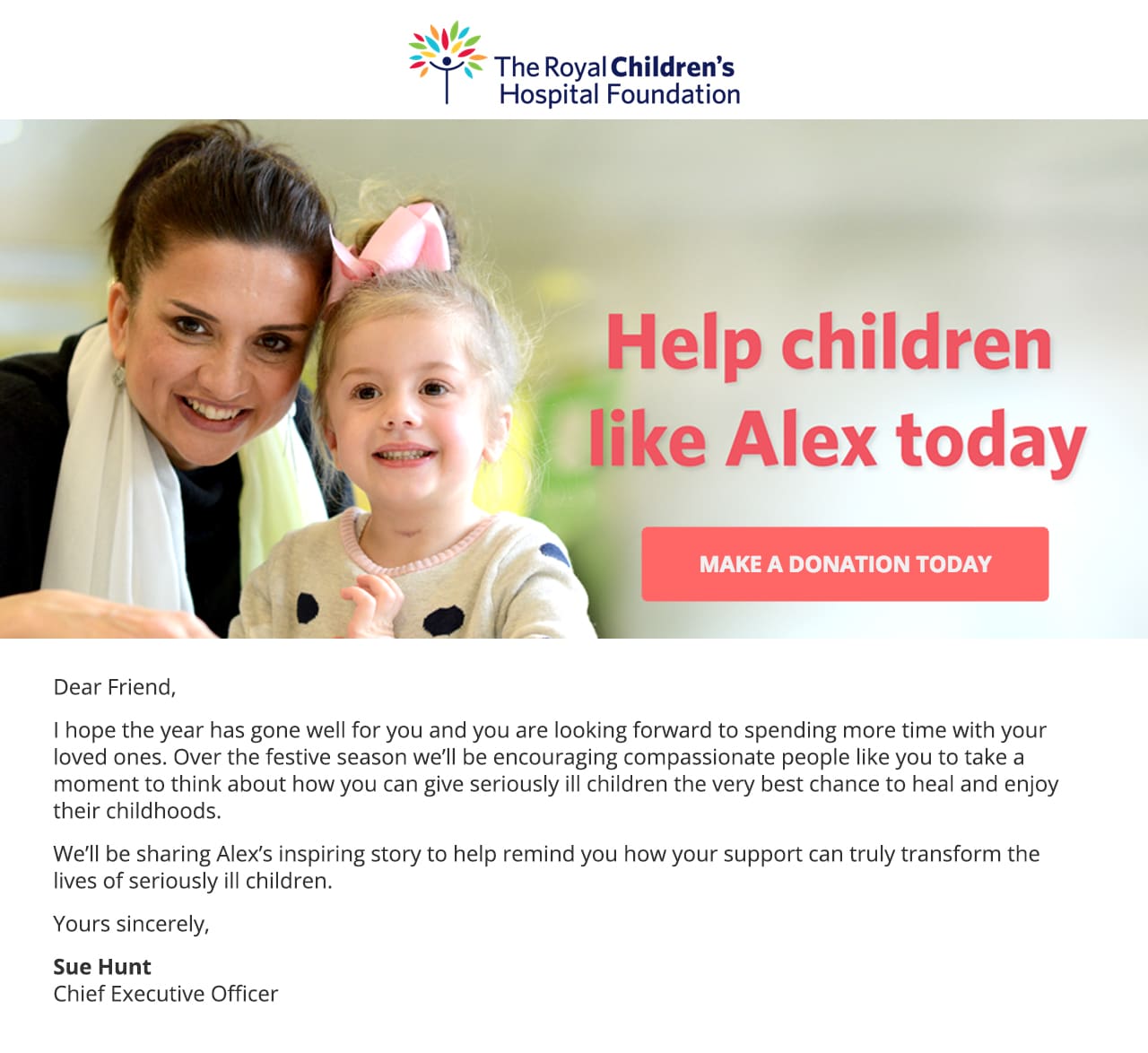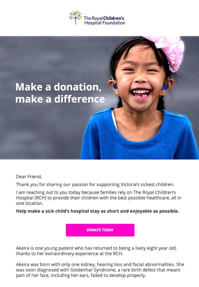 The Royal Children’s Hospital is on a mission to improve the health and wellbeing of Victoria’s children by providing superior healthcare services for adolescents and their families. Email marketing serves as a powerful tool for the RCH to touch lives with stories of the unmatched contribution fundraising has made toward their organization.