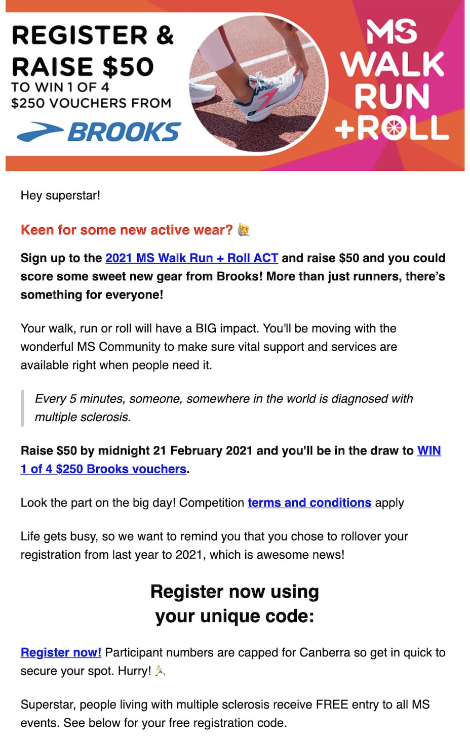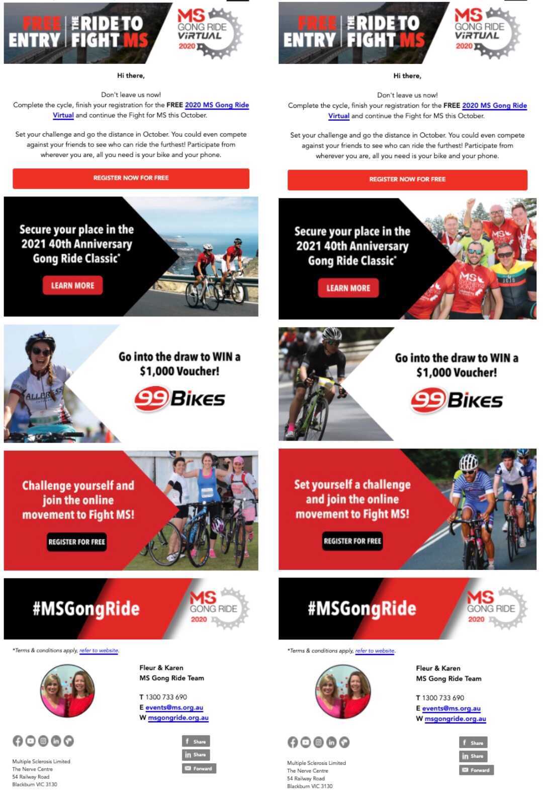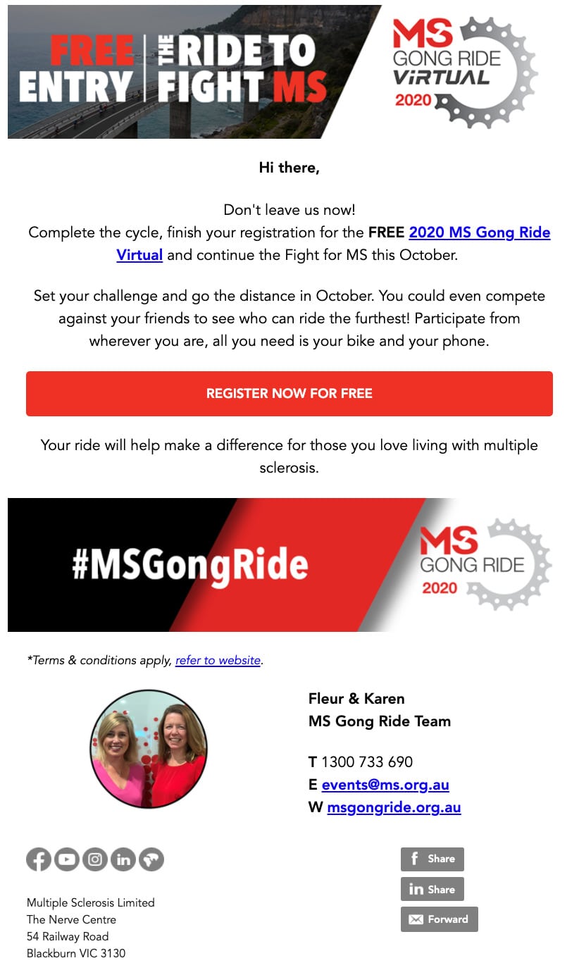 Multiple Sclerosis Limited uses email as a core way to raise funds and engage participants for a wide variety of events, from readathons to cycling challenges. A single event might include 60 or more emails sent out.