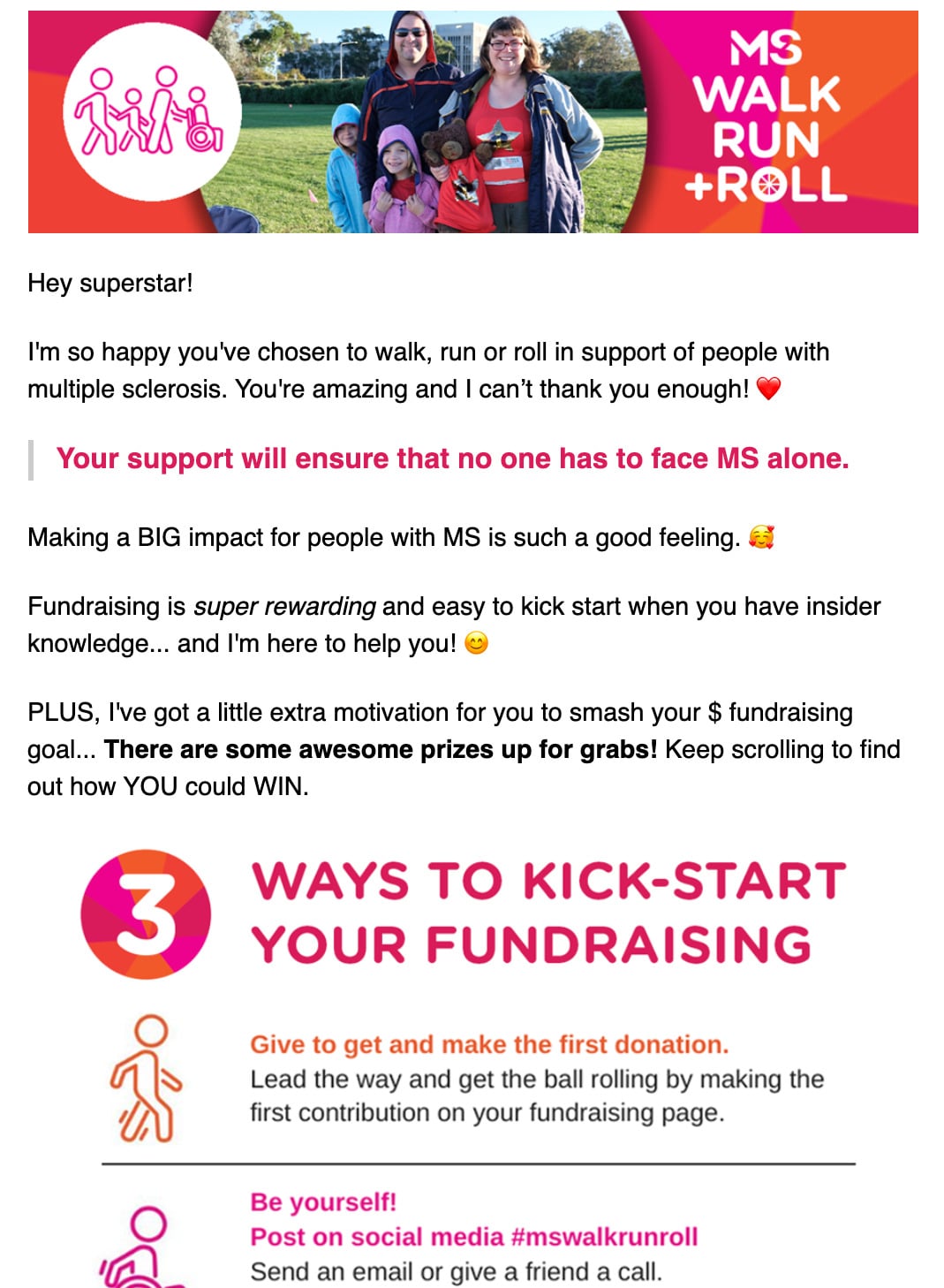 Though email is MS Limited’s greatest fundraising tool, it doesn’t work in a vacuum. The organization uses individual phone calls, SMS, social media, and other channels to keep its community engaged and push its mission forward.