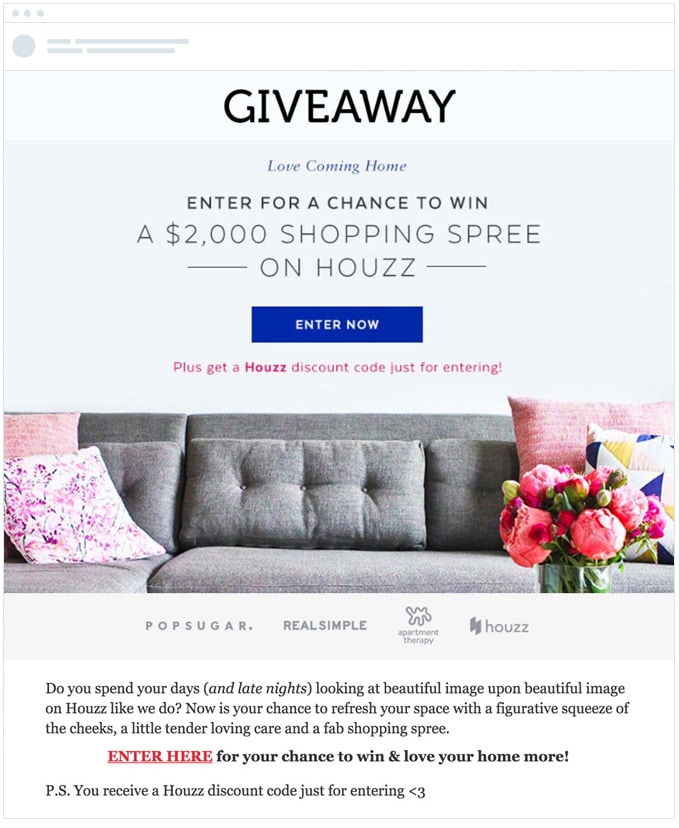 Apartment Therapy partners with complementary brands for giveaways, like an epic shopping spree. To be entered for a chance to win, it’s as easy as providing your email address. Since partners promote these programs to their audiences, giveaways have become one of their most successful tactics for acquiring new subscribers.