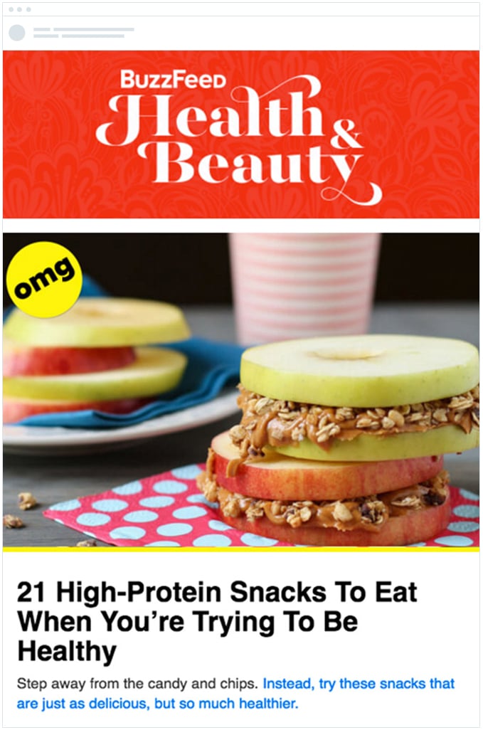 To feed the wide needs of their subscribers, BuzzFeed has over 20 email newsletters that are catered to subscribers’ specific interests, like Health and Beauty as seen in this example email that shares content about healthy snacking: