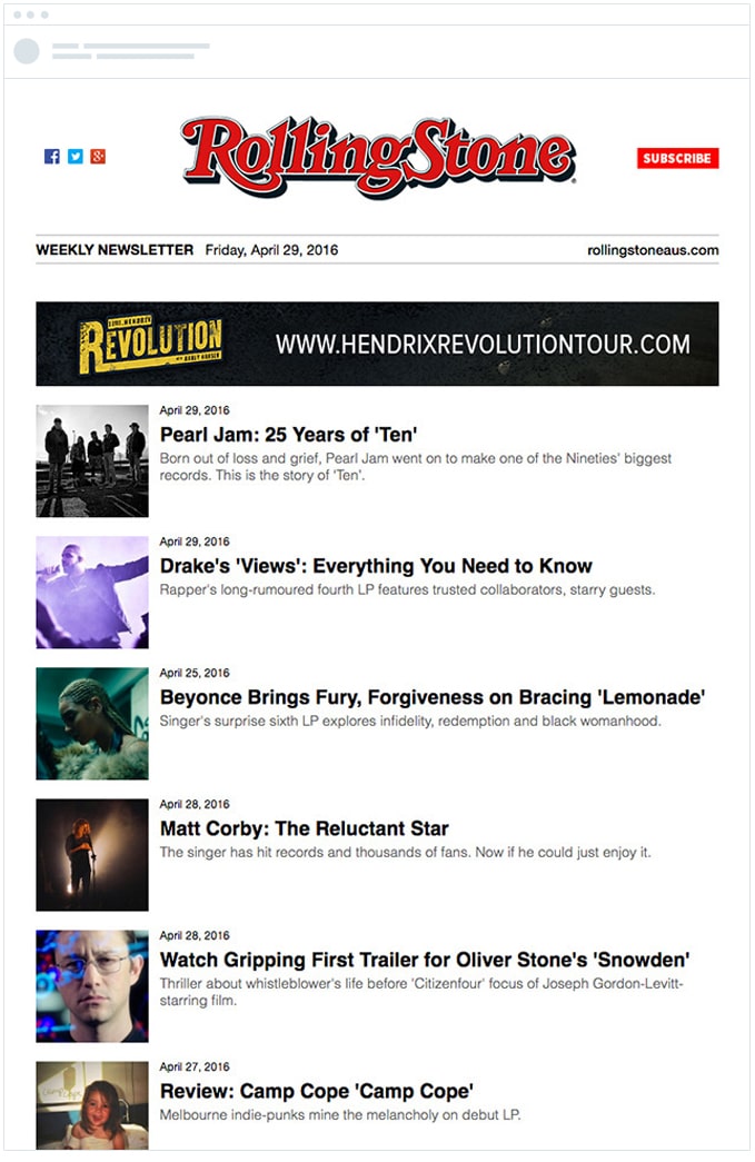 Rolling Stone as a magazine has rocked content for nearly 50 years. They continue to drum up excitement and keep their subscribers current about the latest music news, movie and album reviews, TV show recaps, politics, and pop culture happenings via their website. They use email marketing to drive visitors to the site to consume and engage with their latest news.