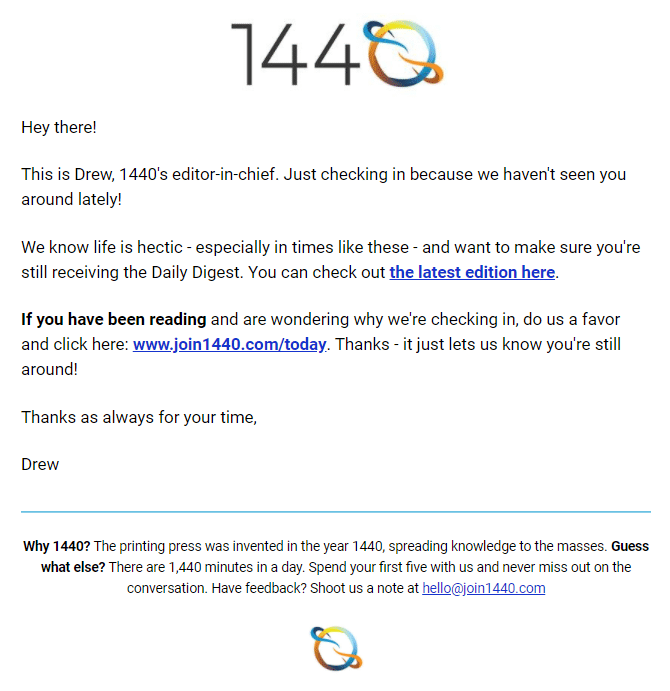Additionally, the 1440 Media team has a drip campaign set up for those who have temporarily lost interest, helping the team recover subscribers.