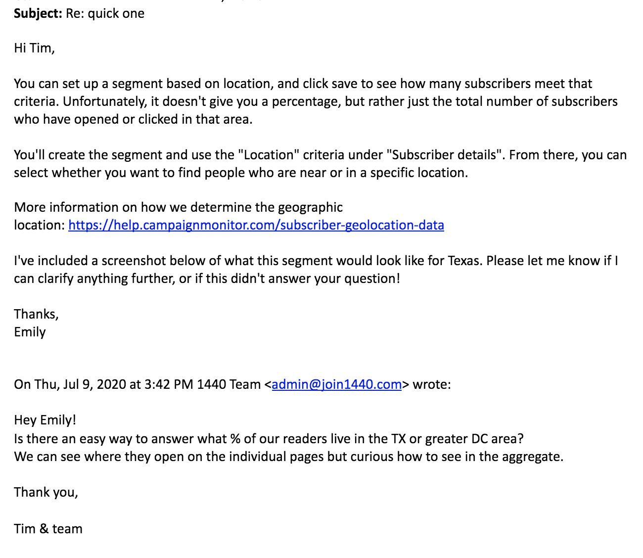 “Despite how critical it is to the business, we don’t have a strong technical background in email sending. So, the ability to have access to experts is absolutely crucial. Campaign Monitor support can help us diagnose any problems and, very explicitly, tell us how to fix those problems.” —Drew Steigerwald, Co-founder of 1440 Media