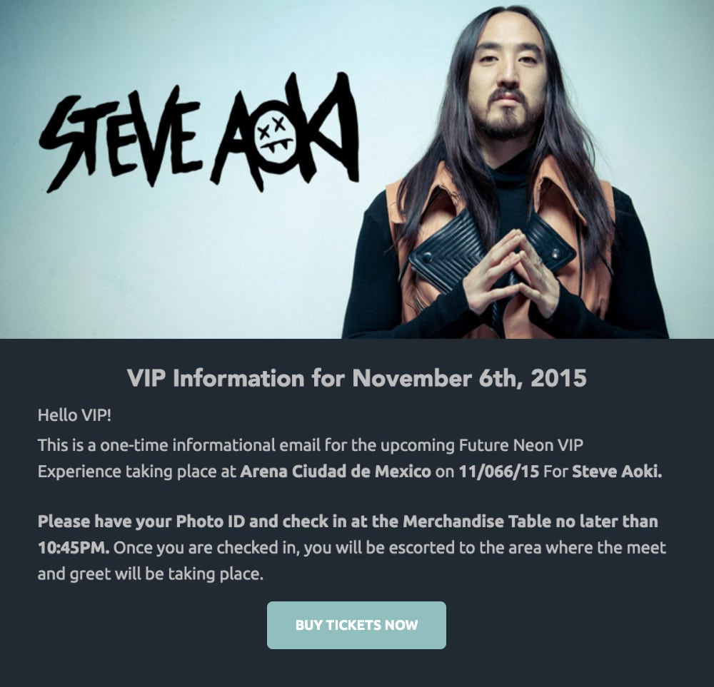 Segmenting well-known fans, Wonderful Union used Campaign Monitor to invite avid Aoiki listeners to join him at the VIP Meet & Greet before his “Neon Future Experience” show.