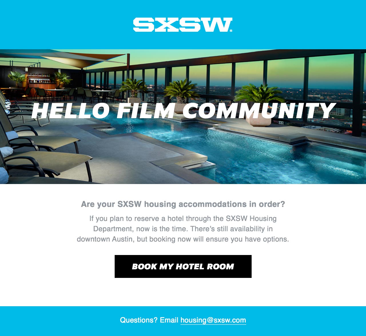 SXSW creates customized campaigns for different audiences, or segments, based on subscribers’ specific interests, like film music, or interactive. This targeted campaign was delivered to registrants of the Film portion of the event, informing them about their accommodation options, and encouraging them to book housing soon.