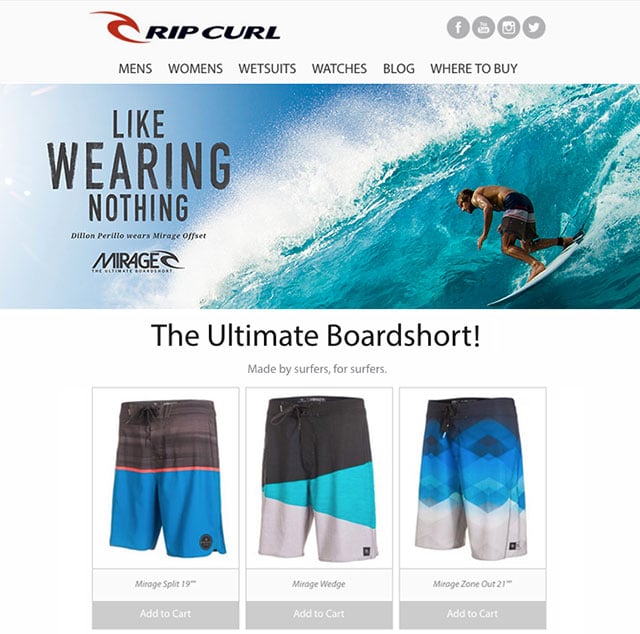Take a peek at the campaign that marketed one of Rip Curl’s most popular items, the Mirage Boardshort. Designed by an elite team of surfers, The Mirage has the best fit, fabric, and performance that a surfer could dream of—and the email campaign to sell it.