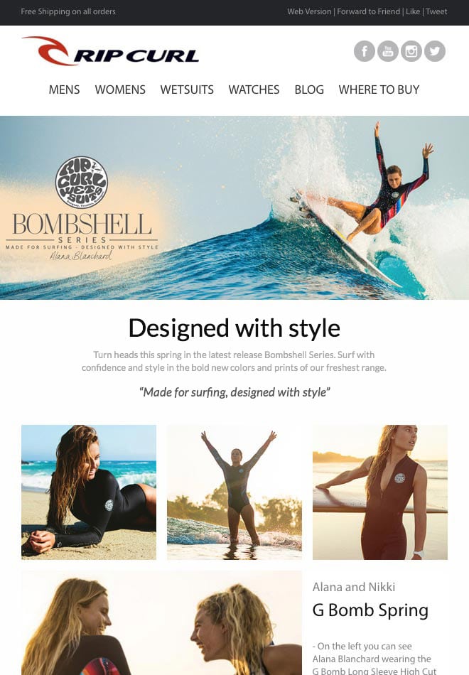 Australian designer and retailer Rip Curl is the go-to choice for surfers across the globe. This leading athletic sponsor drives sales with emails that give wave-loving customers the content they’re after. Showcasing the world’s best surfers and must-have styles, Rip Curl email campaigns are designed for a “shop now” conclusion.