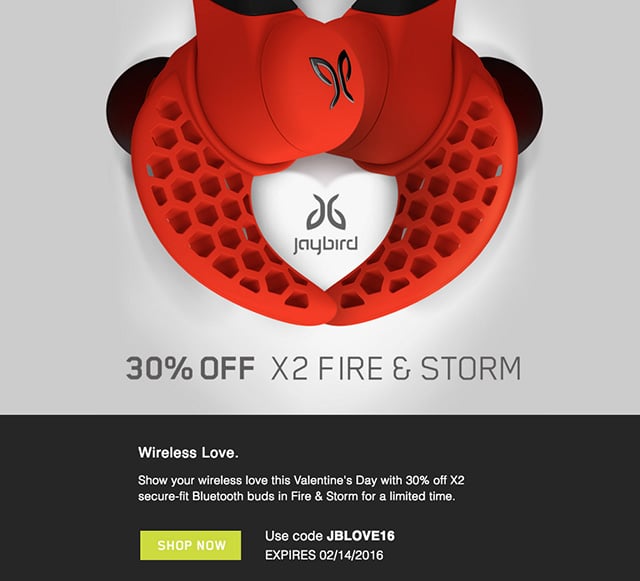 Jaybird takes advantage of the holidays and sends their fans irresistible seasonal specials, like this Valentine’s Day discount.