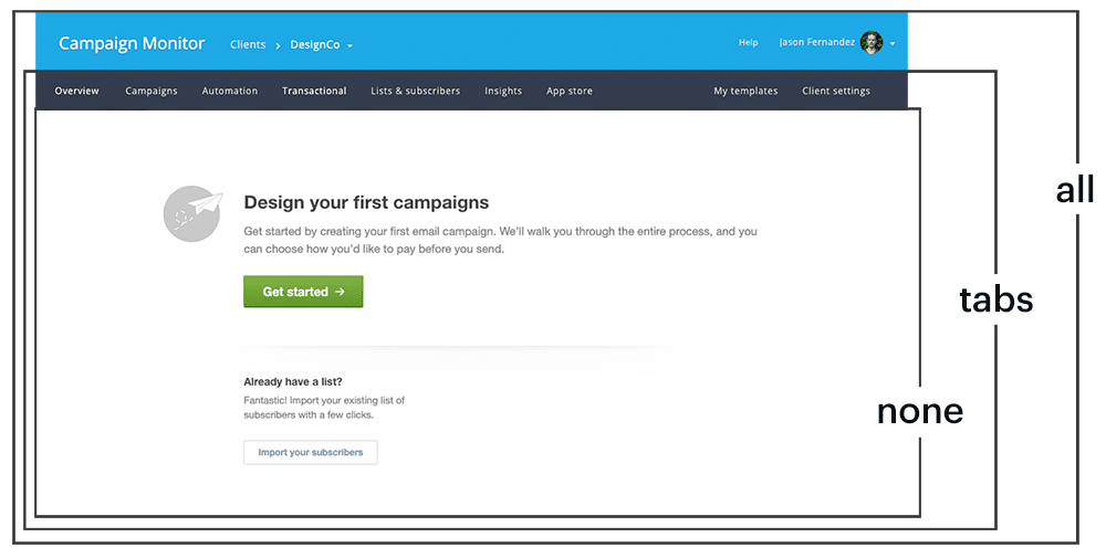 - Chrome What Campaign Monitor navigation to show. Valid options are "All", "Tabs", or "None". See the screenshot above.