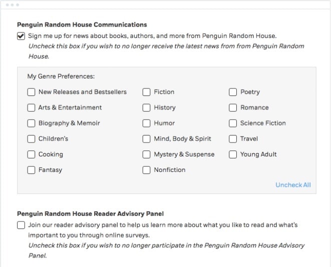 But how does the publisher know which books the subscriber likes? In this case, Penguin Random House sent the subscriber a link to a preference center to select the most appealing book genres. Using that information, all of the newsletters that this subscriber gets are now customized.