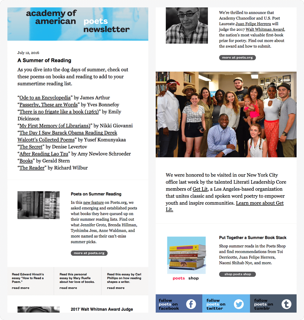 Academy of American Poets knows how to keep their content fresh and diverse. Take a look at the example below. Their newsletter features a list of summer-themed poetry, a feature piece on a judge that will participate in an upcoming competition, and more.