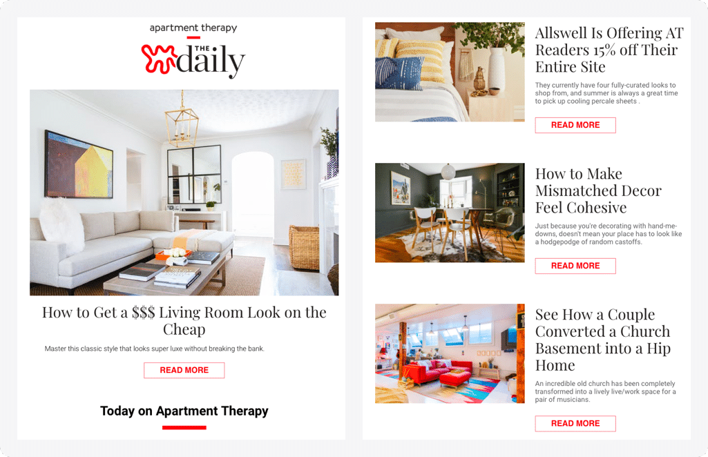Apartment Therapy knows why people come to their website: to look at beautiful photos of dreamy apartments. They apply that same knowledge to their email newsletter. It’s a core pillar of their brand to lead with visuals, because a home is a physical and emotional experience before it can become a digital one.