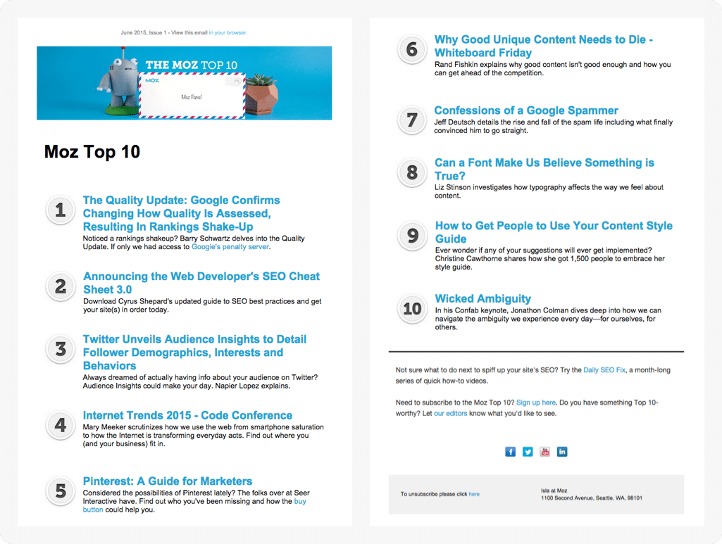 SEO giant Moz sends out a semimonthly email newsletter to share 10 of valuable, recent articles about search engine optimization and digital marketing.