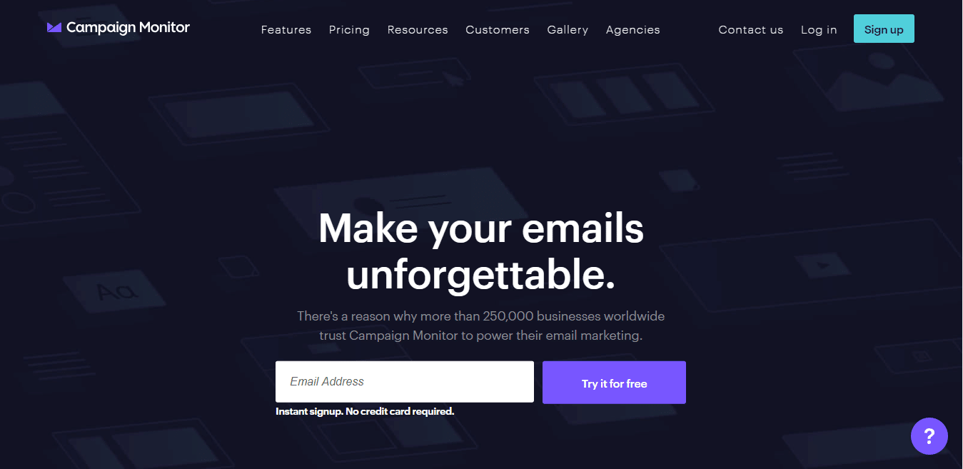 Here’s an example we tested into on Campaign Monitor’s homepage. You’ll notice we use a vibrant purple as the primary CTA, with a teal for the secondary. Both colors pop off the page as they contrast to the dark background pretty dramatically.