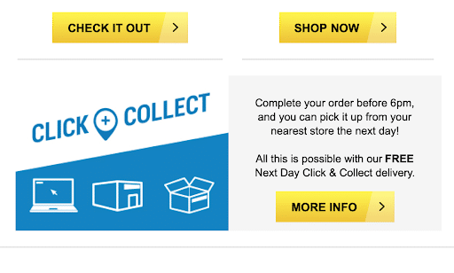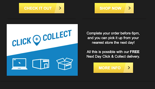 Within the same email, the line dividers are lost in the dark theme and the “Click + Collect” image doesn’t blend in as well with the design.
