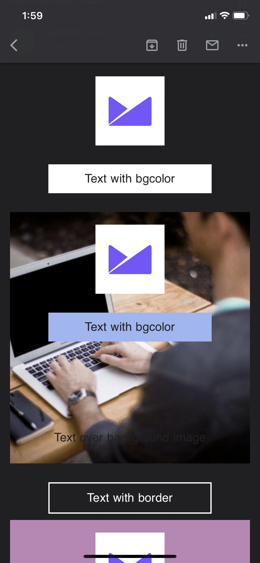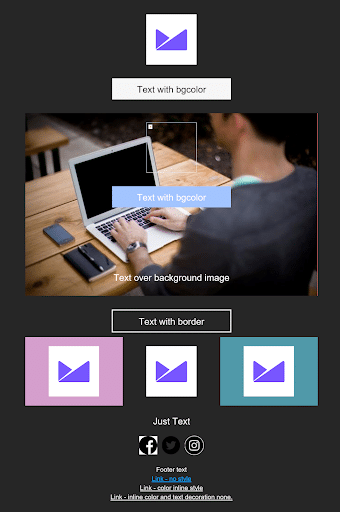 Using live text rather than text in images is best for accessibility, deliverability, and is easier for most email workflows. But as this is HTML- and CSS-based, the colors are subject to change when in Dark Mode, as you can see by the examples above.