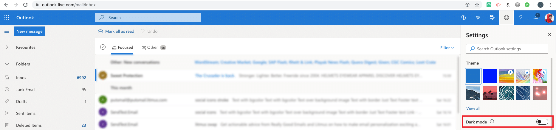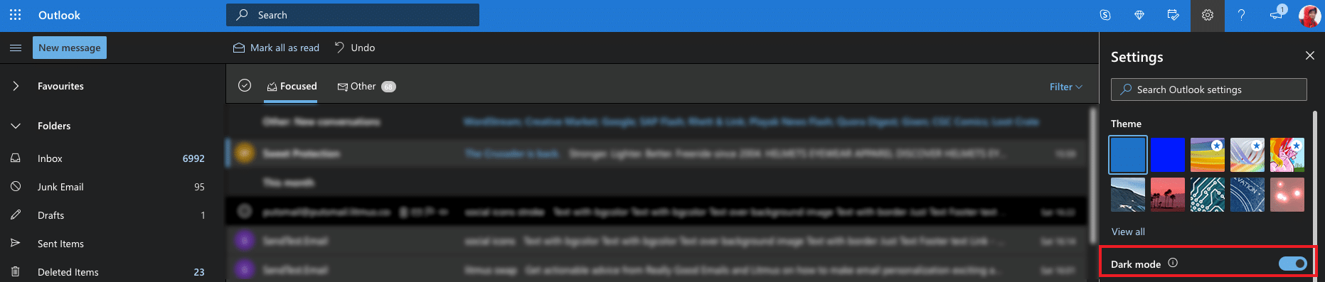 Toggle the Dark Mode on and your interface and emails should now all be in Dark Mode: