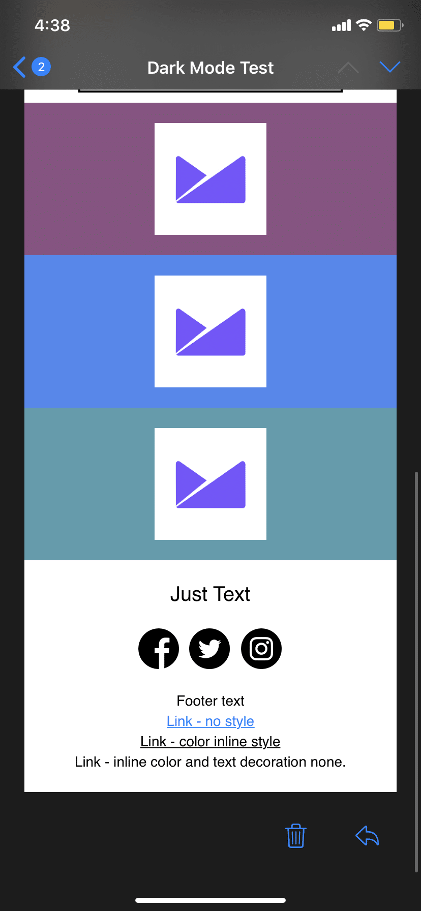 In the last year, big operating systems such as Mac OS and Windows 10 all made apps default to the systems color choice. So if a user chose to work in Dark Mode, all apps would be made dark by default. The developer documentation gives details on how to stop this from happening in your app’s user interface, but you have to actively choose to not switch to Dark Mode. Unfortunately, email clients don’t publish documentation to help email developers.