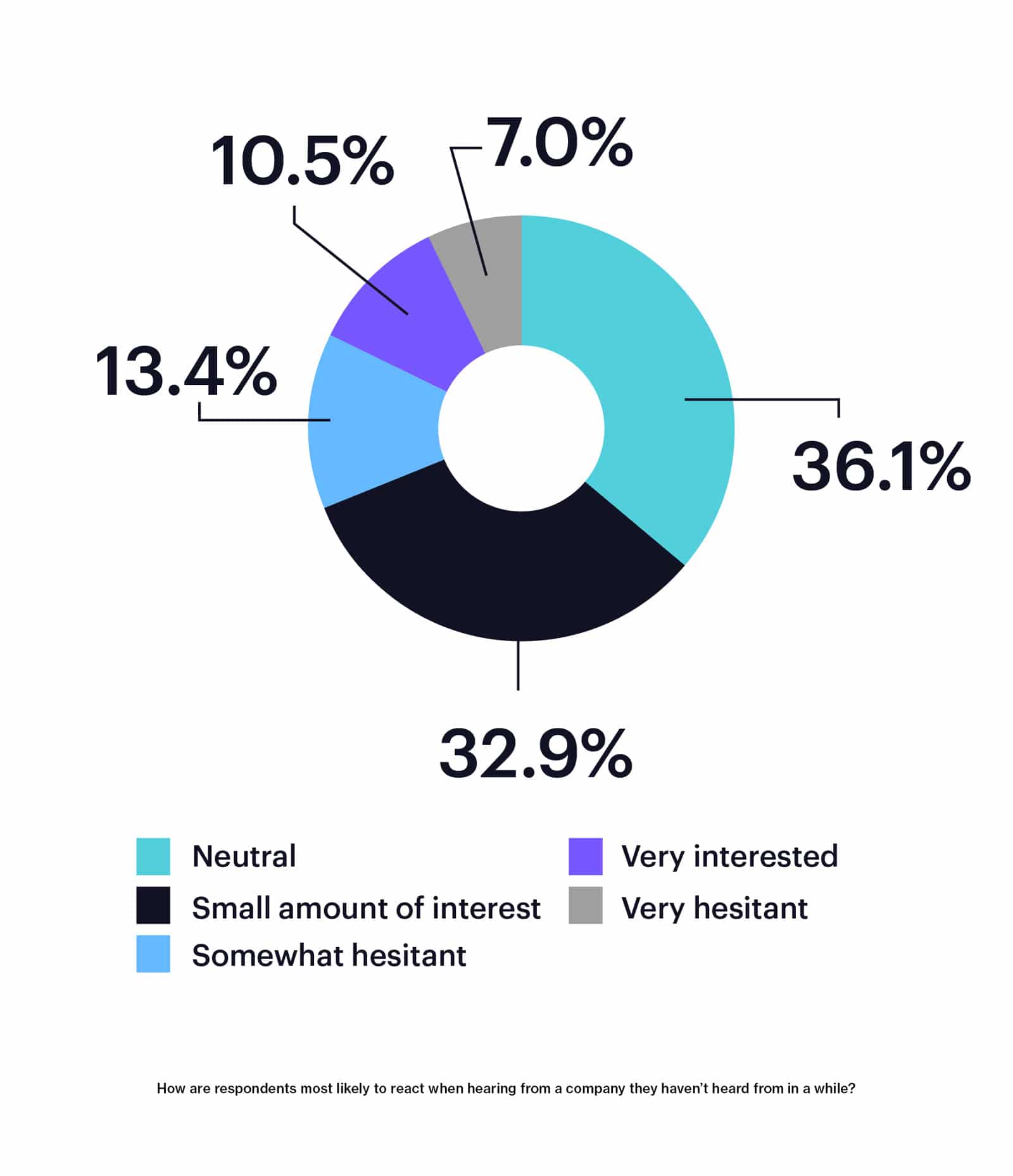 Meanwhile, 13.4% of respondents said they’d be somewhat hesitant and 10.5% said they’d be very interested. Only 7.0% said they’d be very hesitant about interacting with a brand they hadn’t heard from in a while.