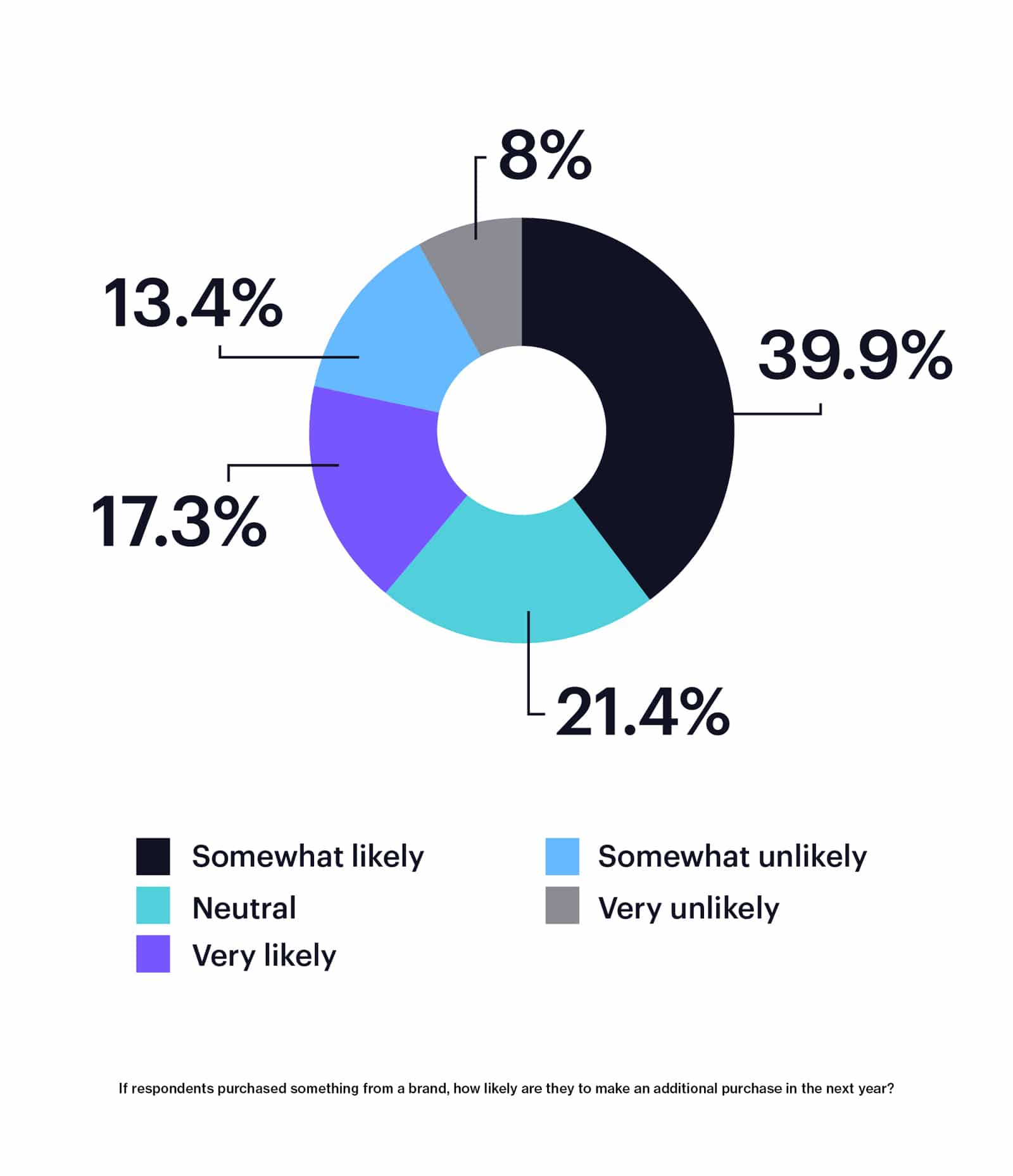 When we asked respondents if they would make another purchase from a brand within the same year, 39.9% said they were somewhat likely to make another purchase, whereas the next largest portion of respondents said they were neutral, 21.4%. And another 17.3% of respondents said they were very likely to make a purchase.