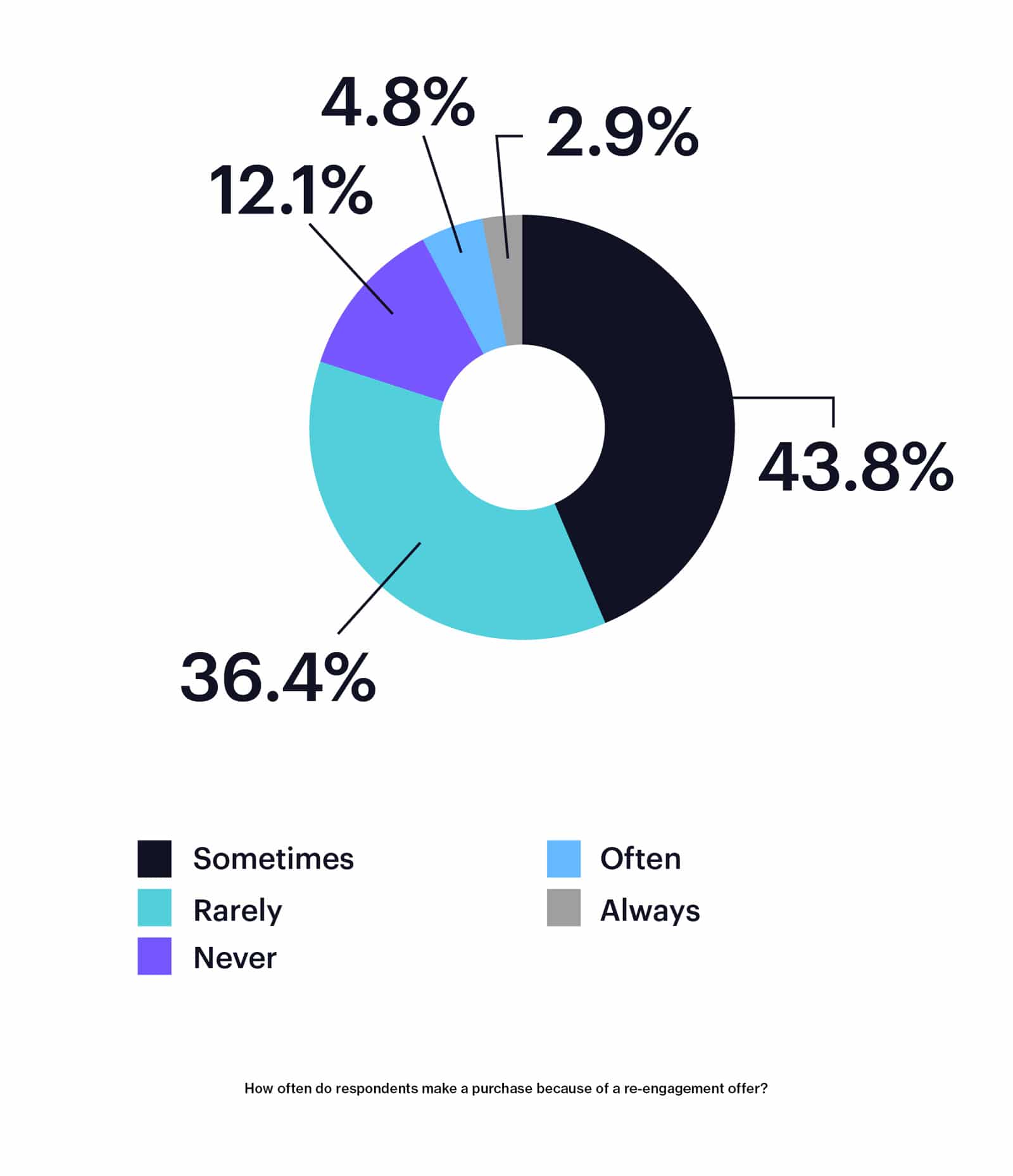 Out of the remaining portion of respondents, 12.1% chose never, 4.8% said often, and finally 2.9% said they always made a purchase after receiving a re-engagement offer.
