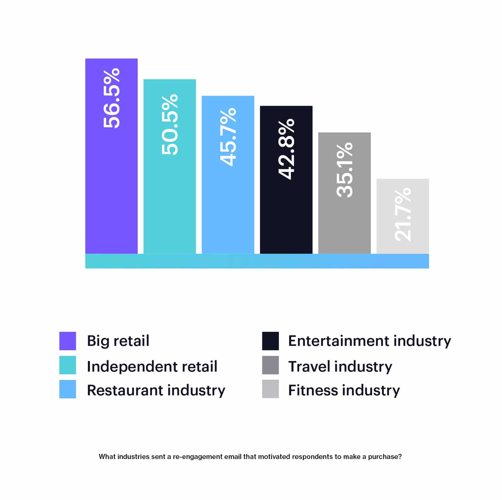 We asked survey respondents which industries had sent them re-engagement emails that led them to make a purchase, allowing respondents to choose all industries that applied. Out of these industries, 56.5% of respondents said big-box retail stores (Target, Walmart, etc) and 50.5% said independent retail stores.