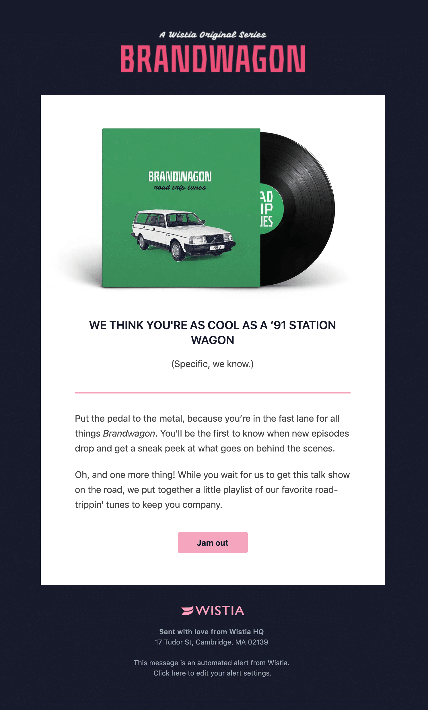The content you send in an email like this will depend on your branding and your industry. If your branding uses a serious tone to convey your messaging, an email you send with the express purpose of surprising and delighting might just include a recent study published in your industry.