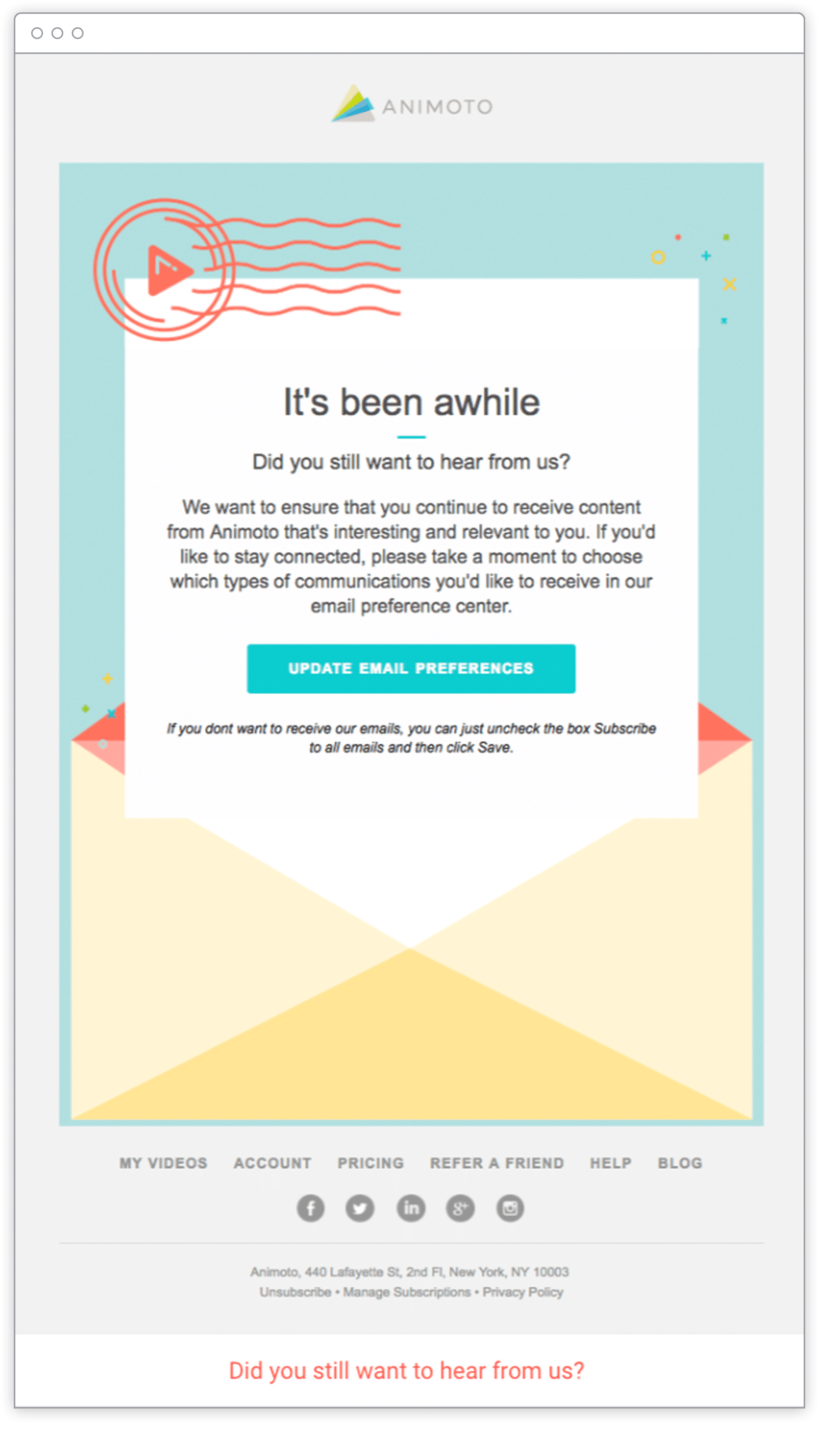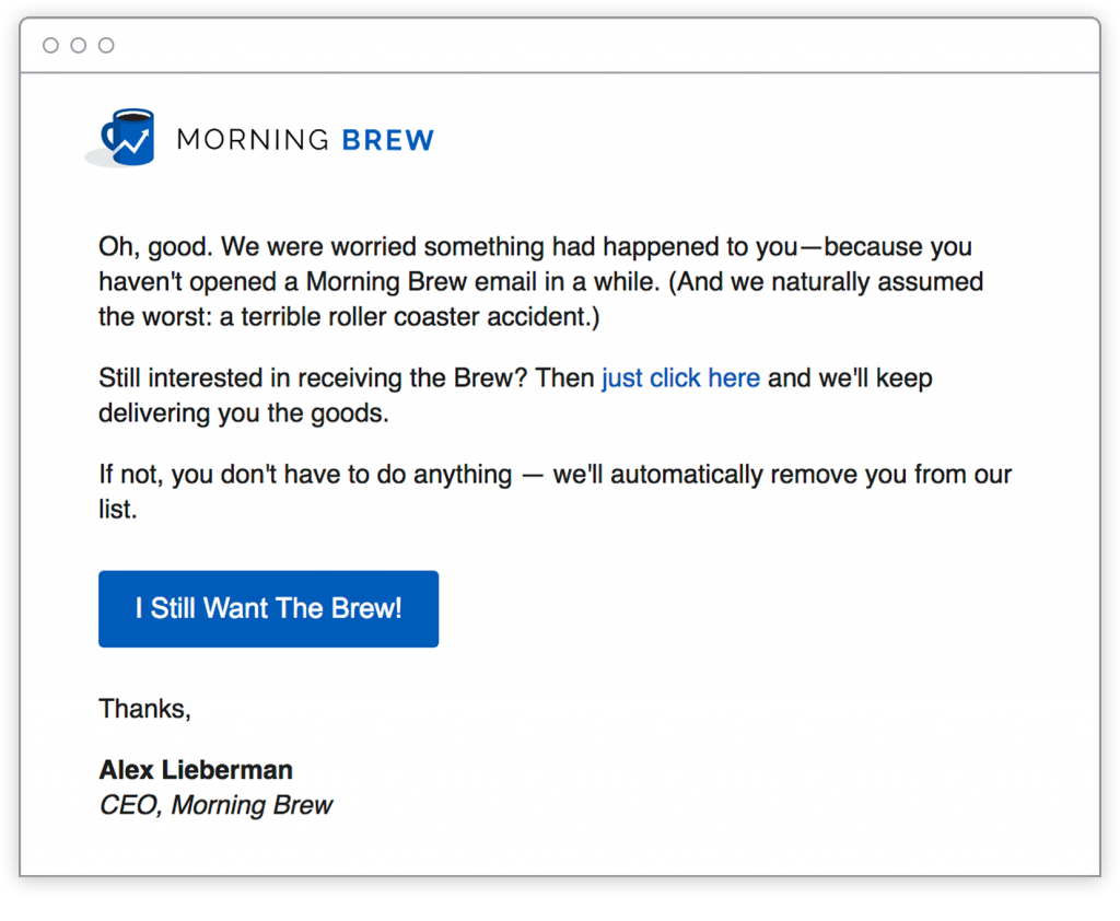 The same can be said here as before—automate this process! Craft a single email that can be sent automatically after a specific time of lowered engagement. This will keep your list hygiene up while keeping your list of to-do’s down.