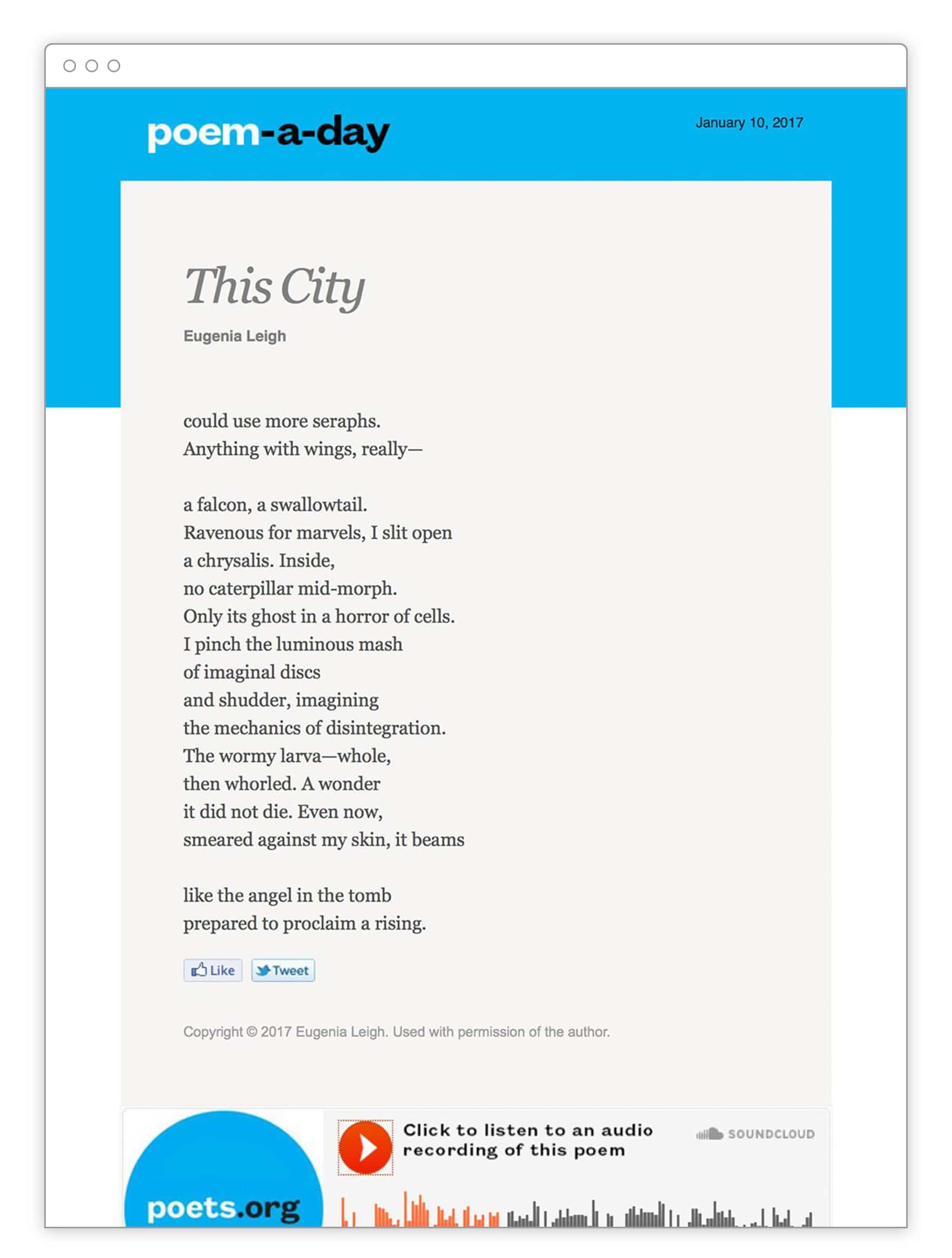 Once you get your subscribers to open your emails, the content of your emails must always pay off the promise of your subject lines, if you ever want your subscribers to open your emails again. The Academy of American Poets demonstrates this with their “Poem a Day” subscriber list. It delivers exactly that: a poem a day in text and audio format.