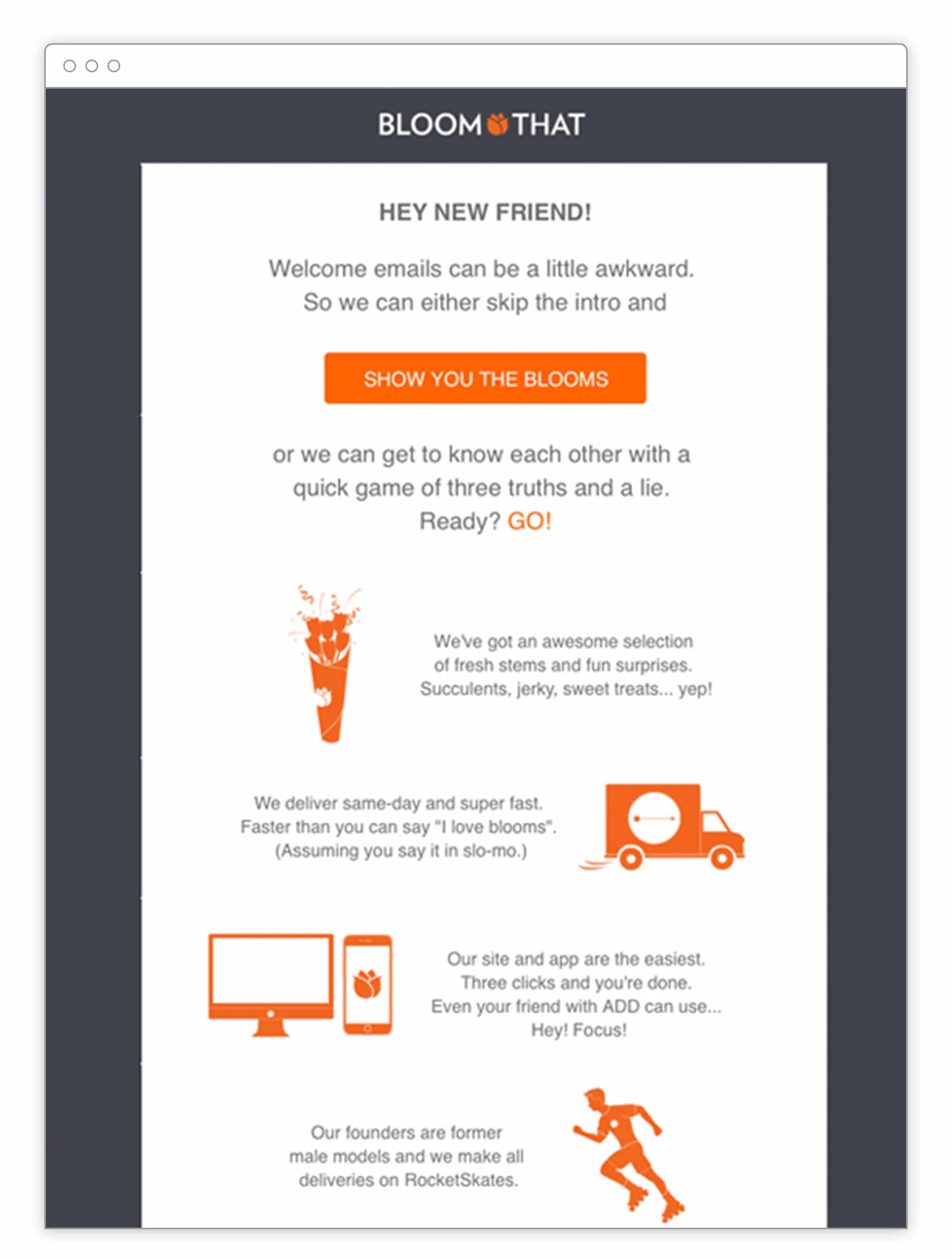 An easy place to start is a three-part welcome series for new opt-ins. Depending on how your subscribers get added to your email list, the first email should go out soon after signing up—within one to 48 hours. Flower delivery service Bloom That welcomes subscribers with a lighthearted email that humanizes their brand: