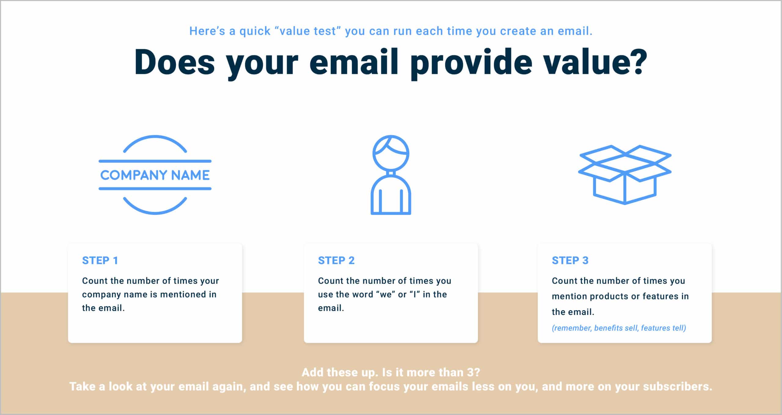 Every time you create an email, ask yourself, “What is in it for the subscriber?” Why should they open this email, and why should they then take action?”