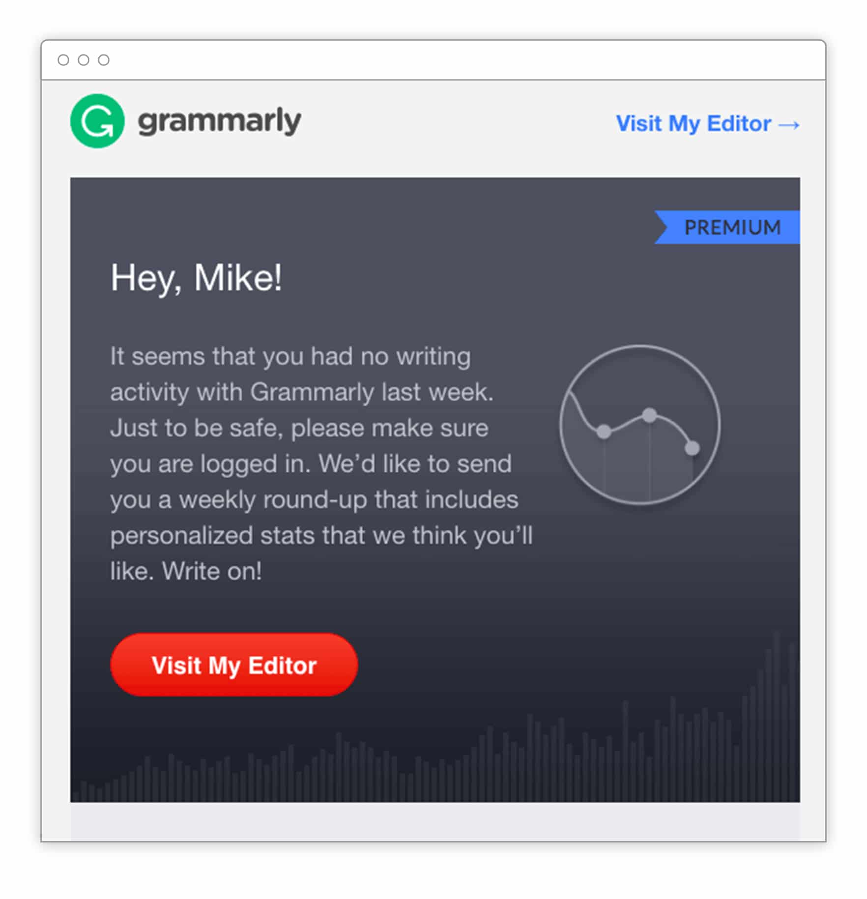 Grammarly uses personalization for the win-back, reminding users of the program’s features and letting them know they’re missed: