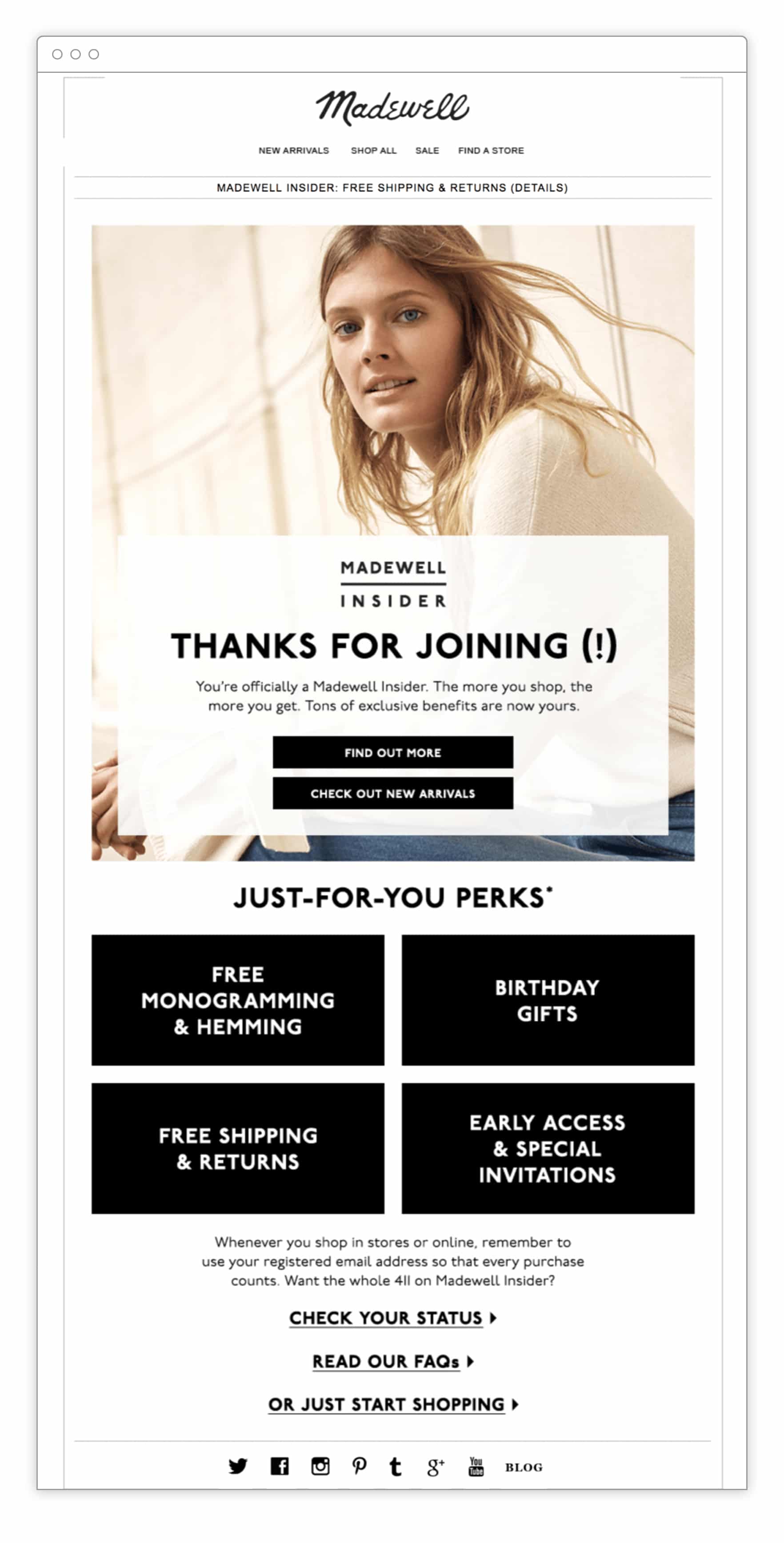 If you simply add people to your list after they download a white paper, but don’t tell them how often you will email them and what’s in it for them, how will they ever know to look for and open your emails? Madewell shows us how it’s done: