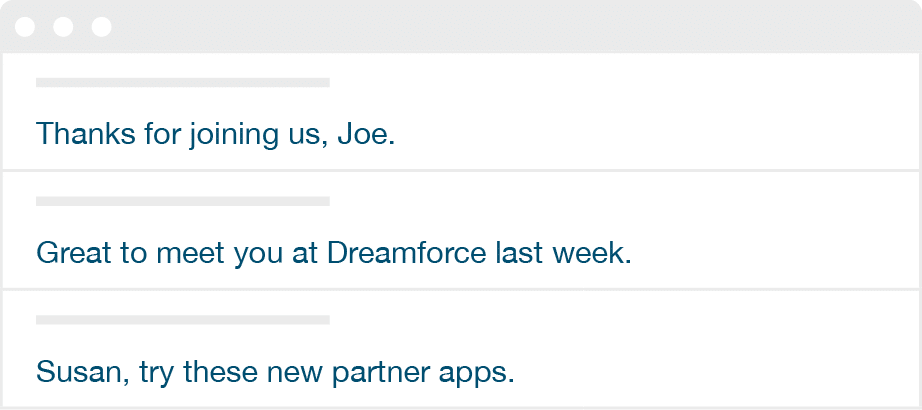 | Personal welcome email from team member or senior executive with photo | Build trust and deepen relationship with subscriber |
