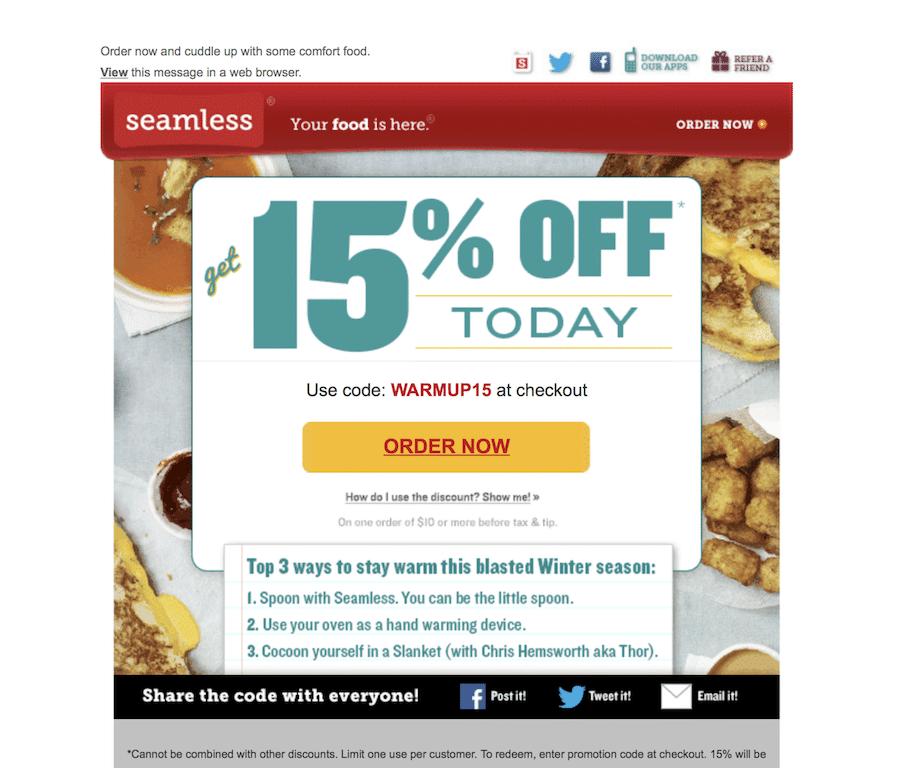 Geotarget your emails based on the weather. For example, Seamless, the online food delivery service, sends geotargeted promotional emails during blizzards and thunderstorms in NYC. Seamless knows New Yorkers would rather stay inside during bad weather, so they send special offers to subscribers in their New York geo.