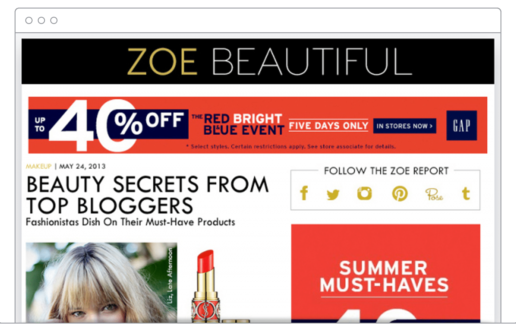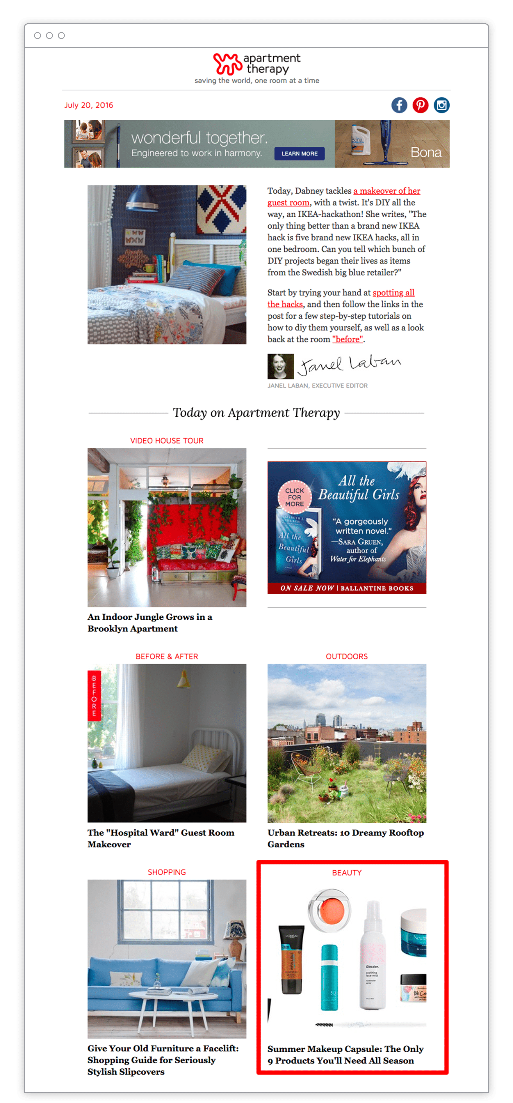 Take a look at the Apartment Therapy newsletter below. The article in the red box, “Summer Makeup Capsule: The Only 9 Products You’ll Need All Season,” is sponsored content.