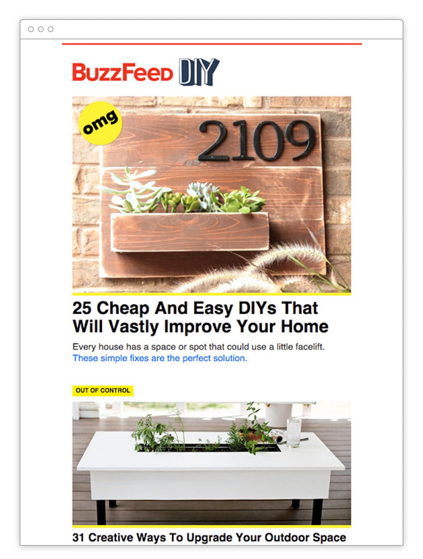 Publishers in the curation category intentionally curate the voice of the brand to provide meaningful content and a thoughtful narrative to the audience. This results in newsletters that are more personal and differentiated with controlled quality. For example, BuzzFeed curates different newsletters based on subscriber interests. Their team curates a customized DIY newsletter based on what they believe subscribers will like.