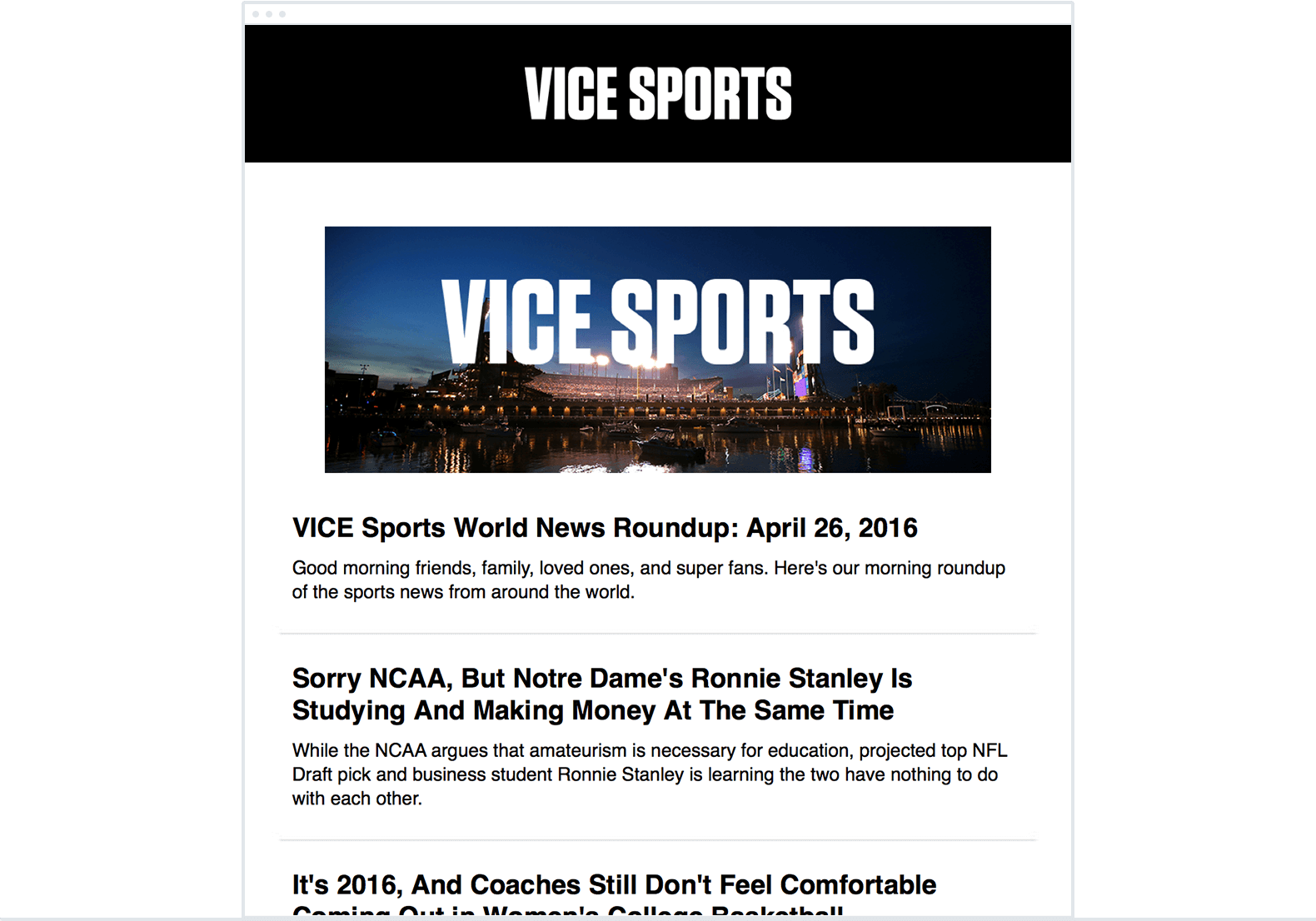 Most publishers send something similar, but each has its unique take. VICE, for example, gives subscribers a list of interesting content with story descriptions. This publisher focuses more on the description than on imagery: