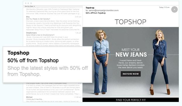The subject line is the short line of text that a subscriber sees before opening your email. 35% of subscribers open an email based on the subject line alone, so you should spend some time crafting one that will spark their interest. Here’s another example from Topshop: