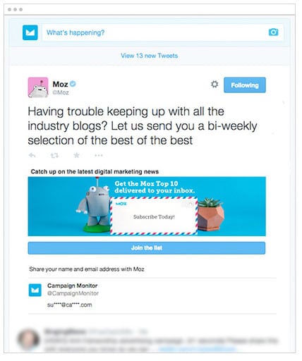 You can sync your Twitter lead generation cards with your Campaign Monitor account, which means all of the contacts that you collect will flow right into your mailing list.