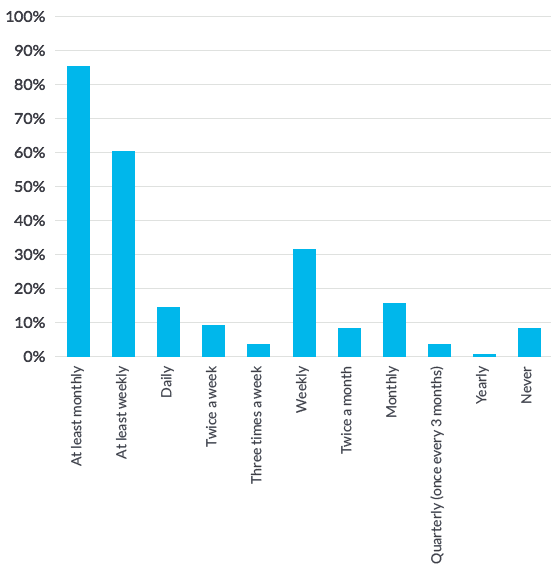 The majority of consumers say they’d like an email from a brand once a week or less, according to statistics from Marketing Sherpa. About 61% of consumers say “at least once a week” is best, 87% of consumers want to receive emails “at least monthly,” and about 15% want to receive emails daily.
