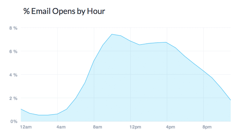 Research shows that 53% of emails are opened during normal business hours, between 9 a.m. to 5 p.m. Email activity hits its stride between 9 a.m. to 11 a.m., as shown by the graph below.