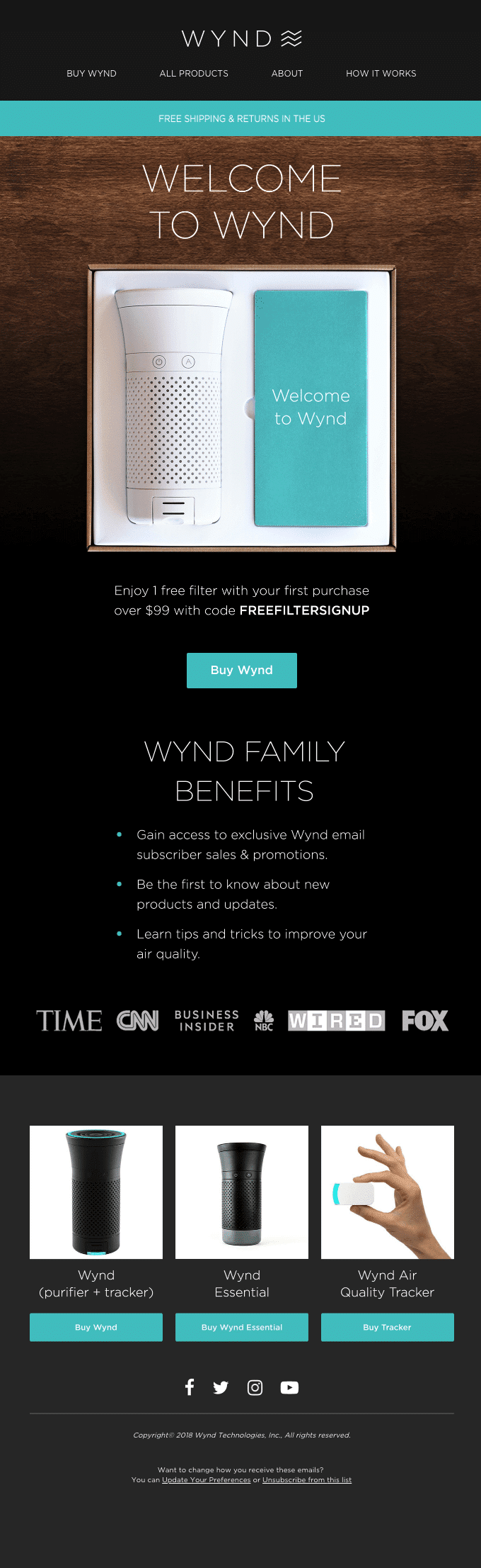 In many cases, first-time subscribers who receive welcome emails from you have only come to learn about your product/service. That’s why you need to include plenty of trust boosters in your welcome email. Again, Wynd nails this one by showing the publications and companies that recommend their product.