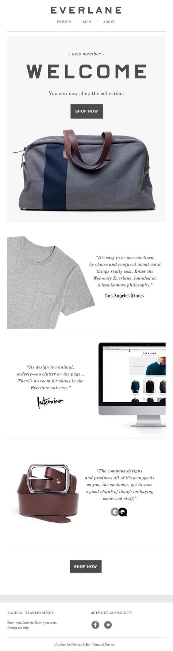This design is stylish, sleek, and simple, but it has all the right features for a transactional email. It’s a minimalistic way to reach out to a new signup, showing off the product catalog with both images and text. This is a great example of how transactional emails don’t have to be packed full of text in order to be effective.