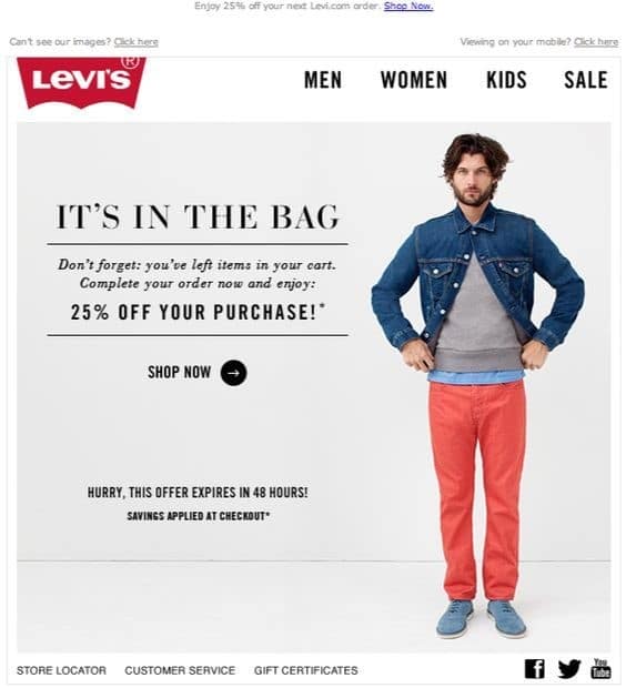 Special offers make for great transactional emails, simply because users love getting a deal from the companies they subscribe to. This email from Levi offers a simple format. The heading is catchy, the text says enough without going overboard, and the specific discount is mentioned. There’s also an easy-to-follow call to action, and details about the time-sensitivity of the deal.