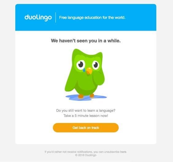 This email is a gentle reminder that a subscriber hasn’t visited the site in a while. The idea behind it is to offer the reader a chance to come back. Not only is there a button as the call to action, but it emphasizes a short lesson as a way of helping the subscriber ease back in.